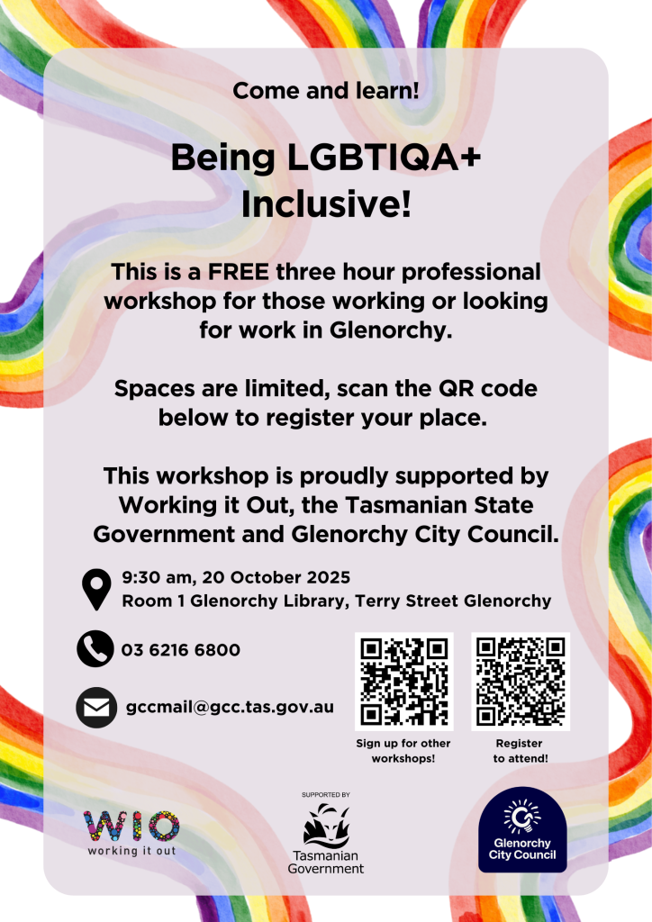 If you can’t make it to this session, sign up to receive an invitation to another free LGBTIQA+ inclusion workshop in Glenorchy: https://forms.office.com/r/BZp47dAJJq